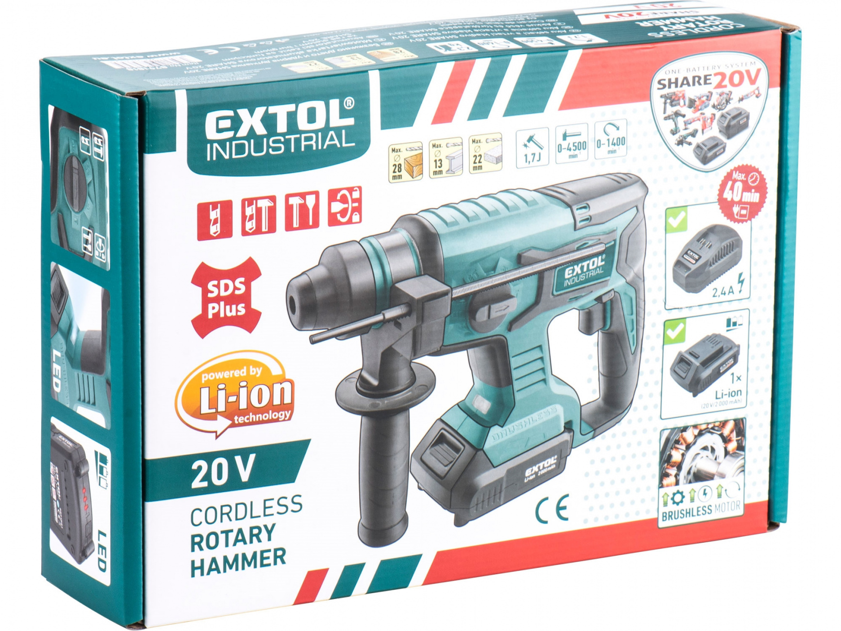 Aku vrtací kladivo je určeno k rychlému vrtání do cihel a betonu pomocí vrtáků s SDS plus stopkou a menším sekacím pracem. Kladivo je poháněno nejmodernějším „brushless" motorem. Tento nový typ motoru má vyšší životnost, je výkonnější a má menší spotřebu el. energie než klasické motory s uhlíkovými kartáči. Díky pneumatickému příklepovému systému je schopno vrtat mnohem rychleji a efektivněji než příklepové vrtačky. Kladivo má zámek sekáče, takže si můžete před sekáním sekáč nastavit do patřičné polohy a při sekání bude kladivo udržovat sekáč v této poloze. Jeho hlavní výhodou je akumulátorový pohon, který dovoluje si vzít kladivo s sebou tam kde s ním potřebujete pracovat, bez ohledu na to, jestli tam je rozvod elektrické energie. Kladivo je vybaveno zpětným chodem pro snadné vytažení zaseklého vrtáku a regulací rychlosti, kterou lze využít dle vrtaného materiálu. Integrované LED osvětlení má zpožděné vypnutí a svítí ještě několik vteřin po vypnutí kladiva. Pro běžnou práci dostačují jeden nebo dva 2000mAh akumulátory, které můžete rychle nabít v rychlonabíječce, pro náročnější nebo delší práci doporučujeme větší akumulátory s kapacitou 4000–8000mAh. Akumulátor lze použít ve všech typech nářadí řady EXTOL SHARE20V. Díky použité Li-ion technologii je ho možné kdykoliv dobíjet, aniž by se tím snižovala jeho kapacita. Li-ion akumulátor ztrácí energii vlivem samovybíjení velmi pomalu a vydrží dlouho nabitý a připravený k použití.