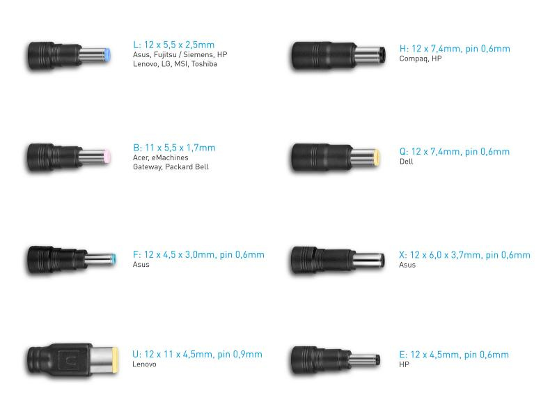 Univerzální nabíjecí adaptér může nahradit zejména adaptéry s výkonem 20W, 30W, 33W, 36W, 40W, 45W, 50W, 60W, 65W, 70W, 72W, 75W, 80W, 85W, 87W, 90W, 95W, 100W, 105W, 110W, 120W, 130W, 135W, 150W, 160W, 170W, 180W, 200W, 210W, 230W, 240W, 250W nebo jiné adaptéry v tomto výkonovém rozmezí.