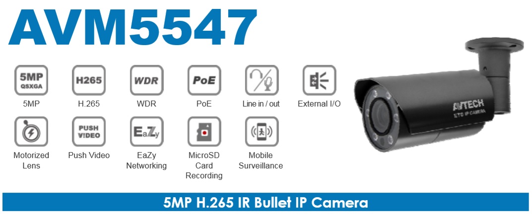 POSLEDNÍ KUS SKLADEM! 5MPX MotorZoom IP Bullet kamera AVTECH AVM5547 s IR přísvitem až 35 metrů při rozšířeném režimu IR (ve standardním režimu 25 metrů) a maximálním video rozlišení 2592 x 1944 px. Moderní design, díky kterému se kamera hodí...