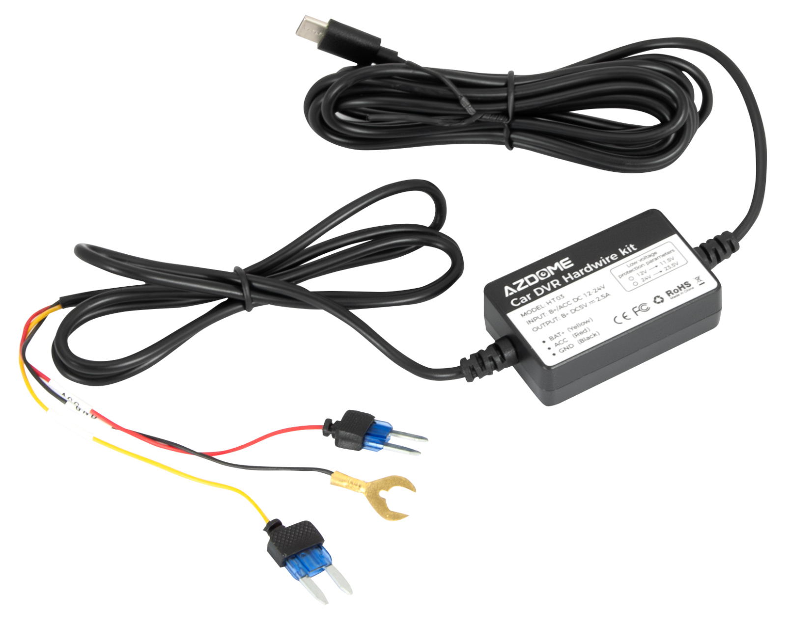 Skrytý zdroj napájení přes pojistkovou skříň pro autokamery CEL-TEC K7 a CEL-TEC M13 s konektorem USB-C. Zařízení slouží pro aktivní parkovací režim (automatické spuštění záznamu při otřesu) i v momentě, kdy je vypnutý motor automobilu. Vstupní napětí 12-24 V, výstupní napětí 5 V, výstupní proud až 2,5 A. Integrovaná ochrana proti vybití autobaterie při 11,5 V (12V baterie) / 23.5 V (24V baterie) (±0,1 V; pokud napětí baterie klesne pod danou hodnotu, napájení se vypne).