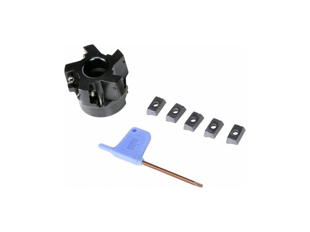 Souprava čelní frézy o ø 50 mm v plastovém kufříku obsahuje upínací hlavu, 5 ks nástrojů ze slinutých karbidů a klíček T15. Hroty lze po opotřebení otočit o 180°.