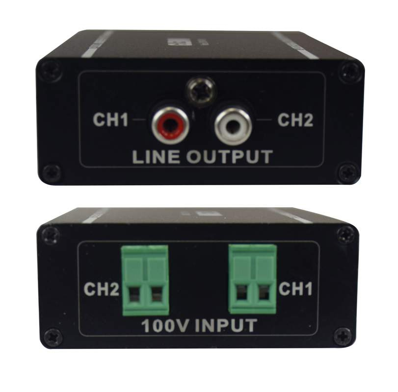 2-kanálový převodník ze 100V úrovně na linkovou úroveň. Tímto způsobem budete mít možnost posílat 70/100V signál z jednoho zesilovače do druhého na velké vzdálenosti a rozšířit tak zvukové pokrytí. Nevyžaduje žádné napájení. Součástí balení je RCA kabel.Vnější...