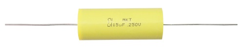 Kondenzátory z metalizované polyesterové fólie typu MKT. Axiální vývody jsou vyrobeny z měděného pocínovaného drátu, povrchová úprava žlutou polyesterovou páskou, čela zalita epoxidovou pryskyřicí, válcové provedení. Jmenovité napětí 250 V DC / 150 V AC, tolerance 5 %, maximální pracovní teplota 85 °C, ztrátový činitel tg delta < 0,01 / 1 kHz.