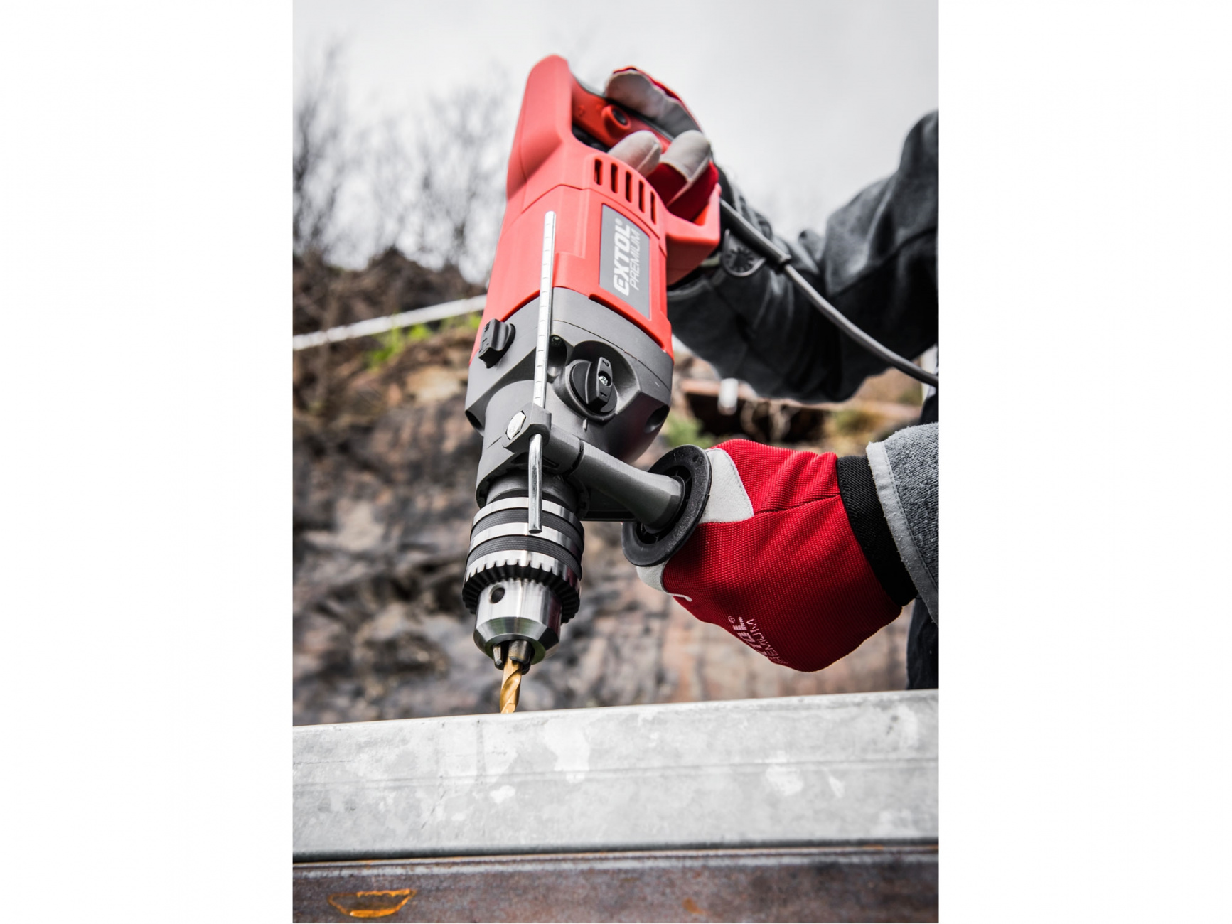 Velmi výkonná a robustní příklepová vrtačka se silným motorem o příkonu 1050W a sklíčidlovou hlavou s upínacím rozsahem 3–16mm je určena zejména pro náročné vrtací práce do tvrdých materiálů, ale je možné ji používat také pro vrtání do měkkých materiálů. Velká rukojeť ve tvaru "D" zajišťuje nejen pohodlné držení vrtačky při těžké práci, ale také chrání vaši ruku před zraněním. Díky silnému výkonu je možné ji používat např. s hadovitými vrtáky, pilovými vykružováky, korunkovými vrtáky nebo vykružovacími vrtáky apod. Provozní spínač umožňuje pozvolný a jemný rozběh otáček pro přesné bodové navrtávání, např. obkladů. Díky komfortnímu přepínání pravého/levého chodu lze bez komplikací vyjmout nástroj z vrtaného materiálu.