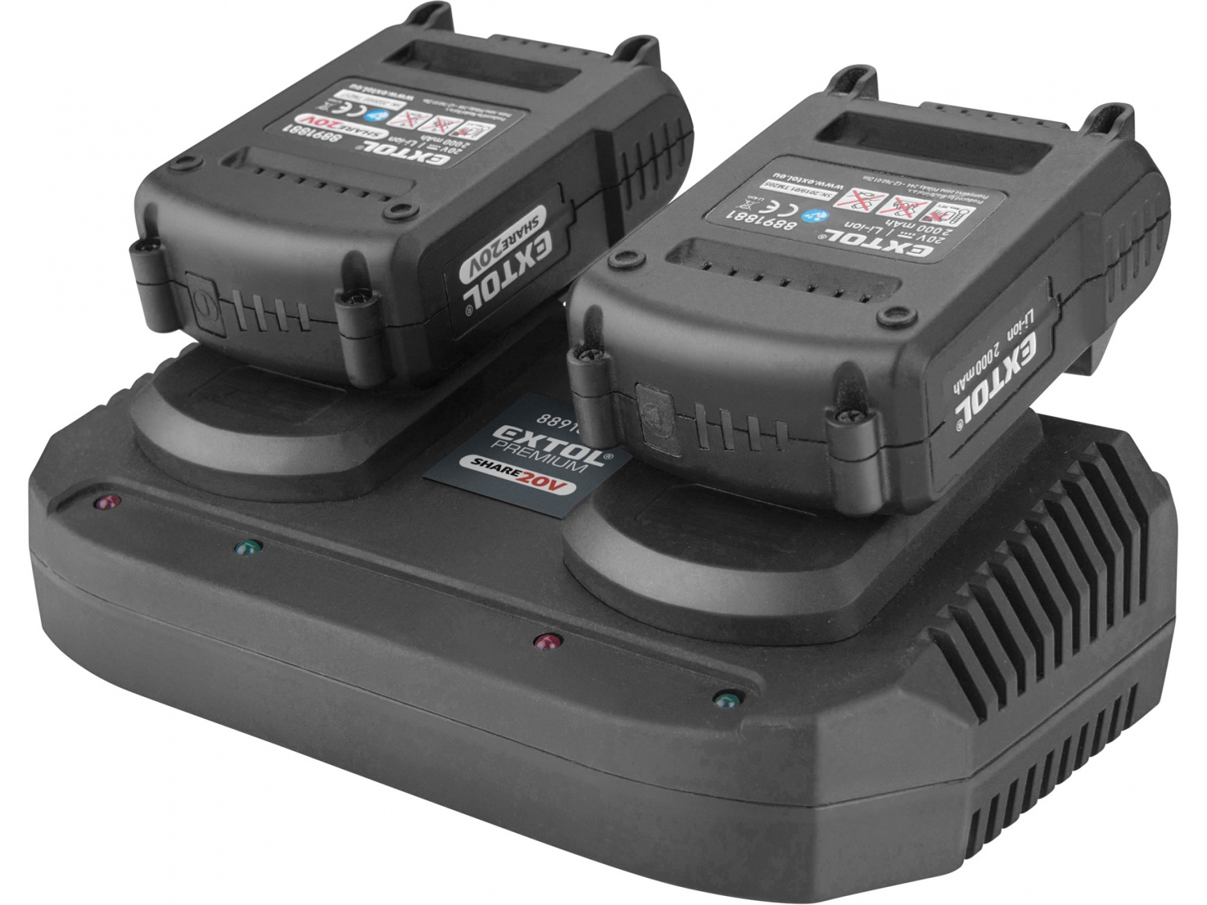 Technické parametry:• technické parametry: 2x3,5A• značka: EXTOL PREMIUM• doplňující parametr: pro aku baterie 2000–8000mAh označené logem SHARE20VDoba nabíjení baterie: 1500mAh – nepoužívat, 2000mAh – 35min, 4000mAh – 60min, 5000mAh – 70min, 6000mAh – 105min, 8000mAh...