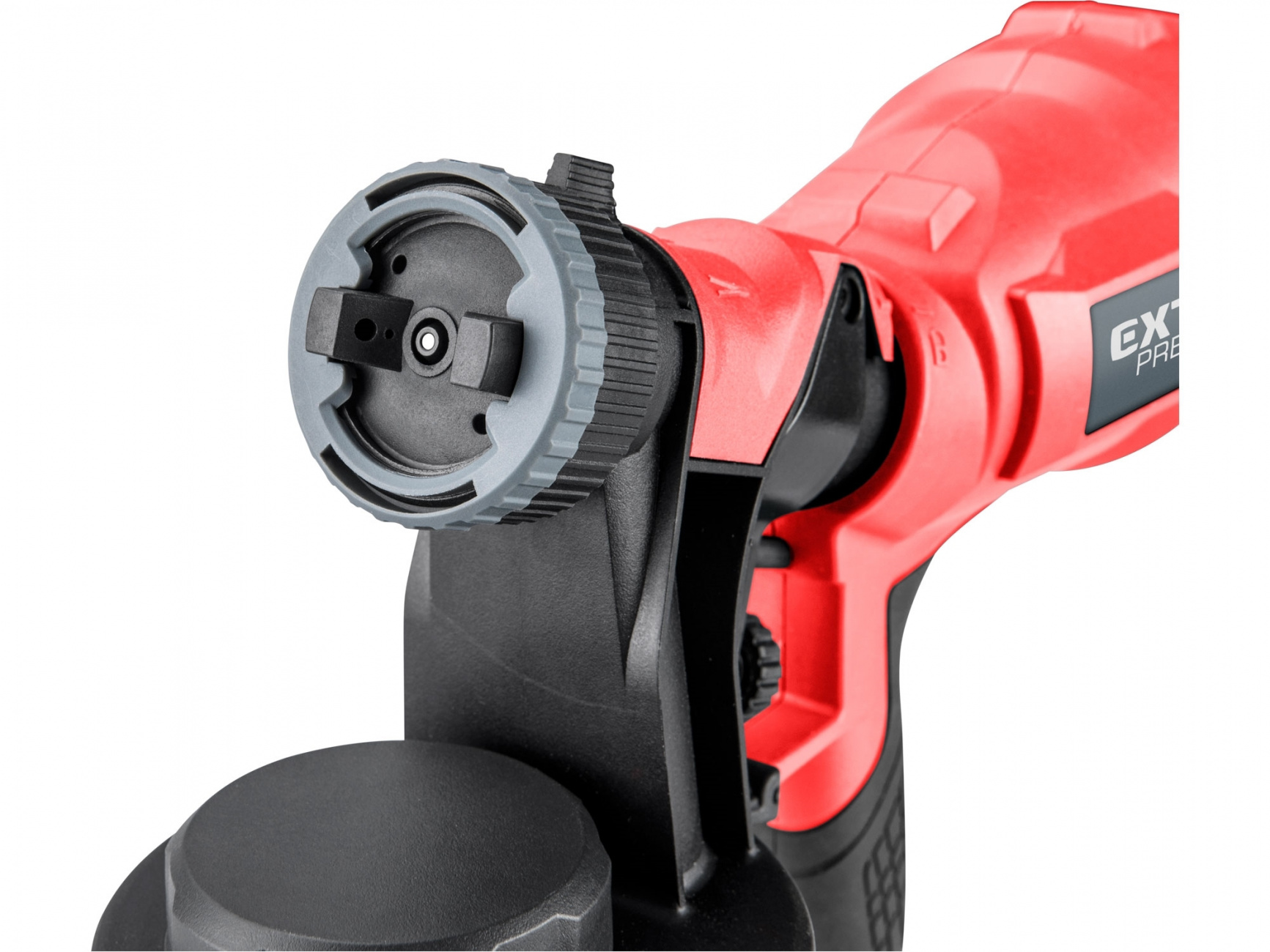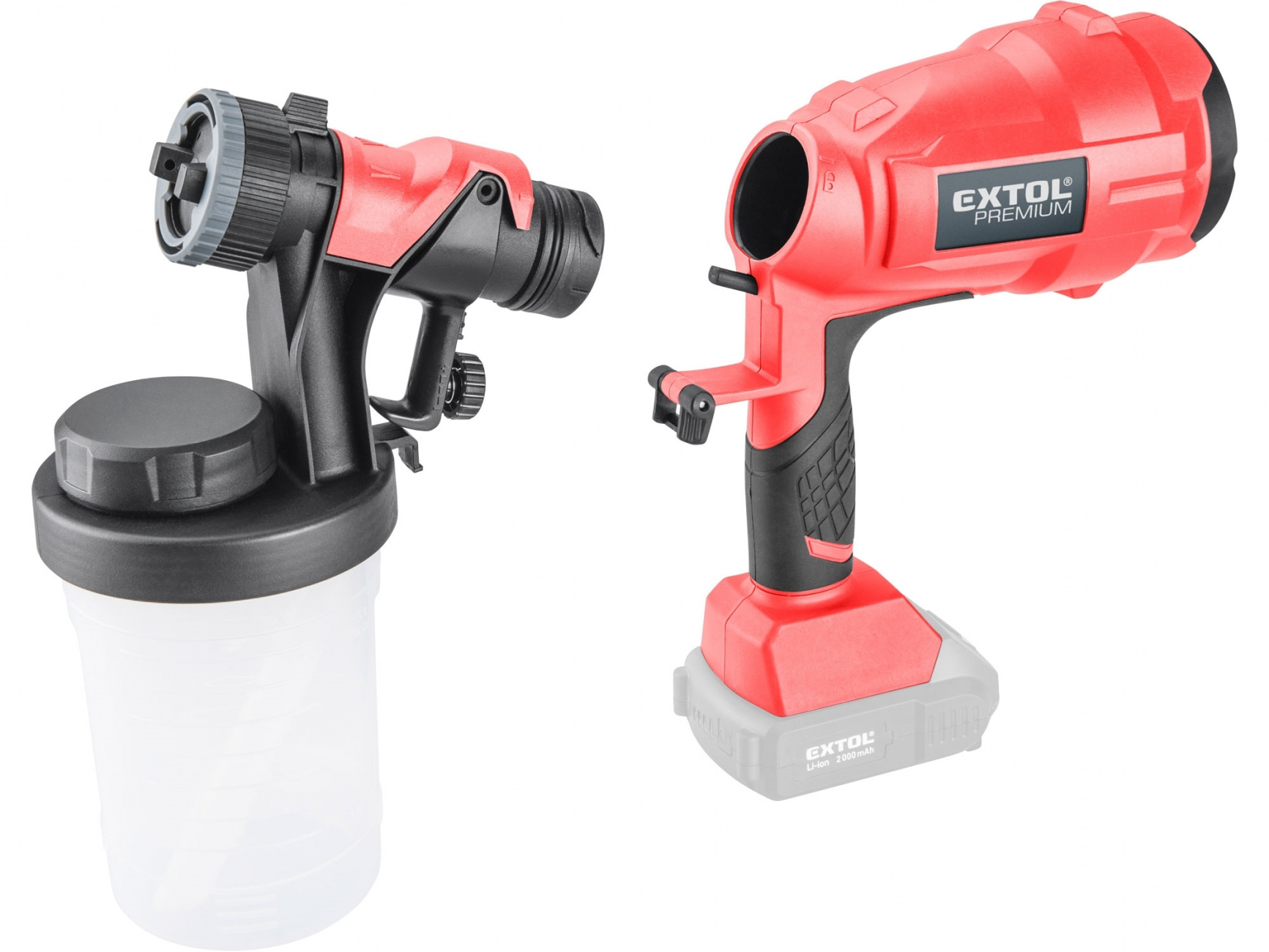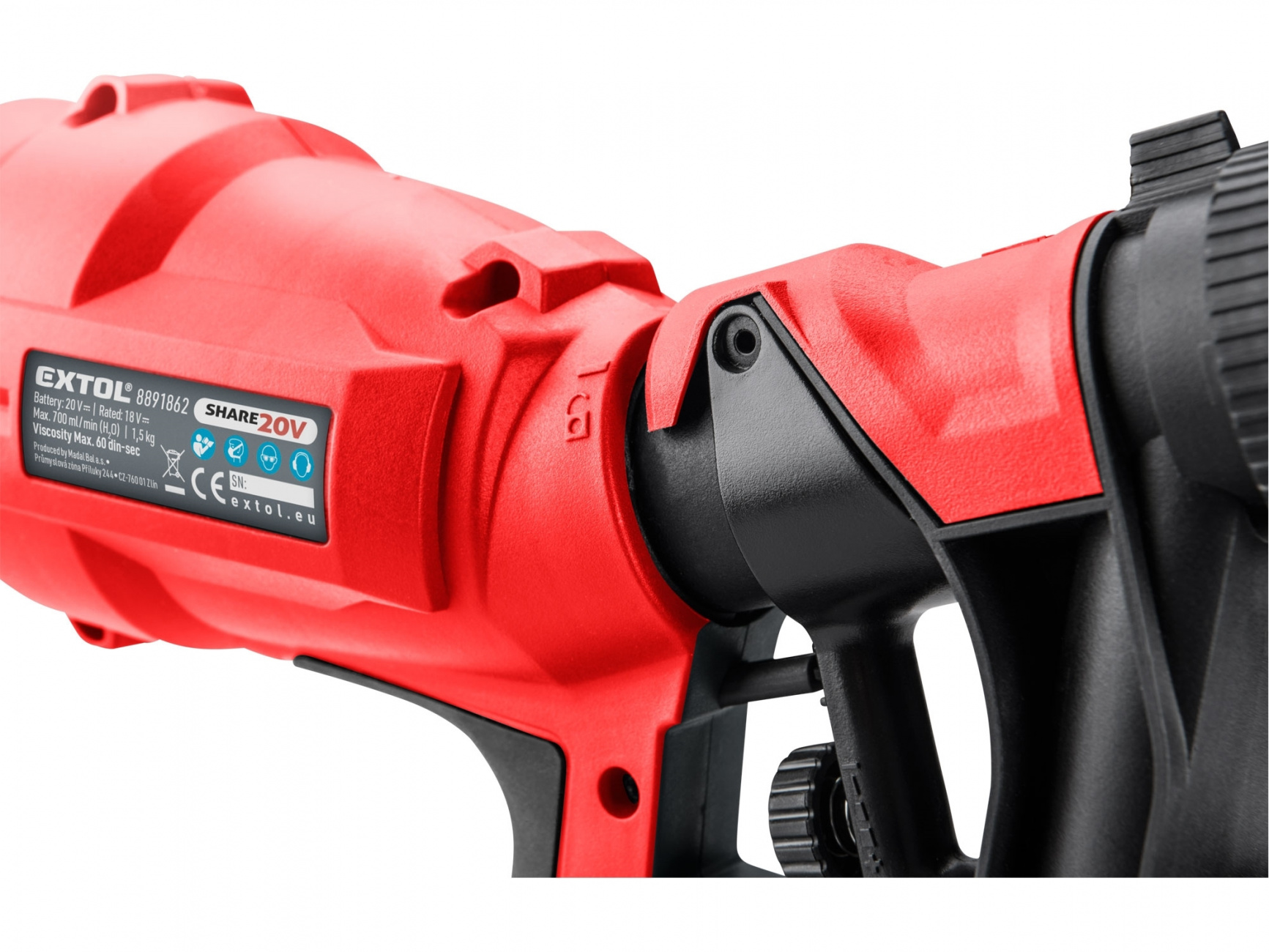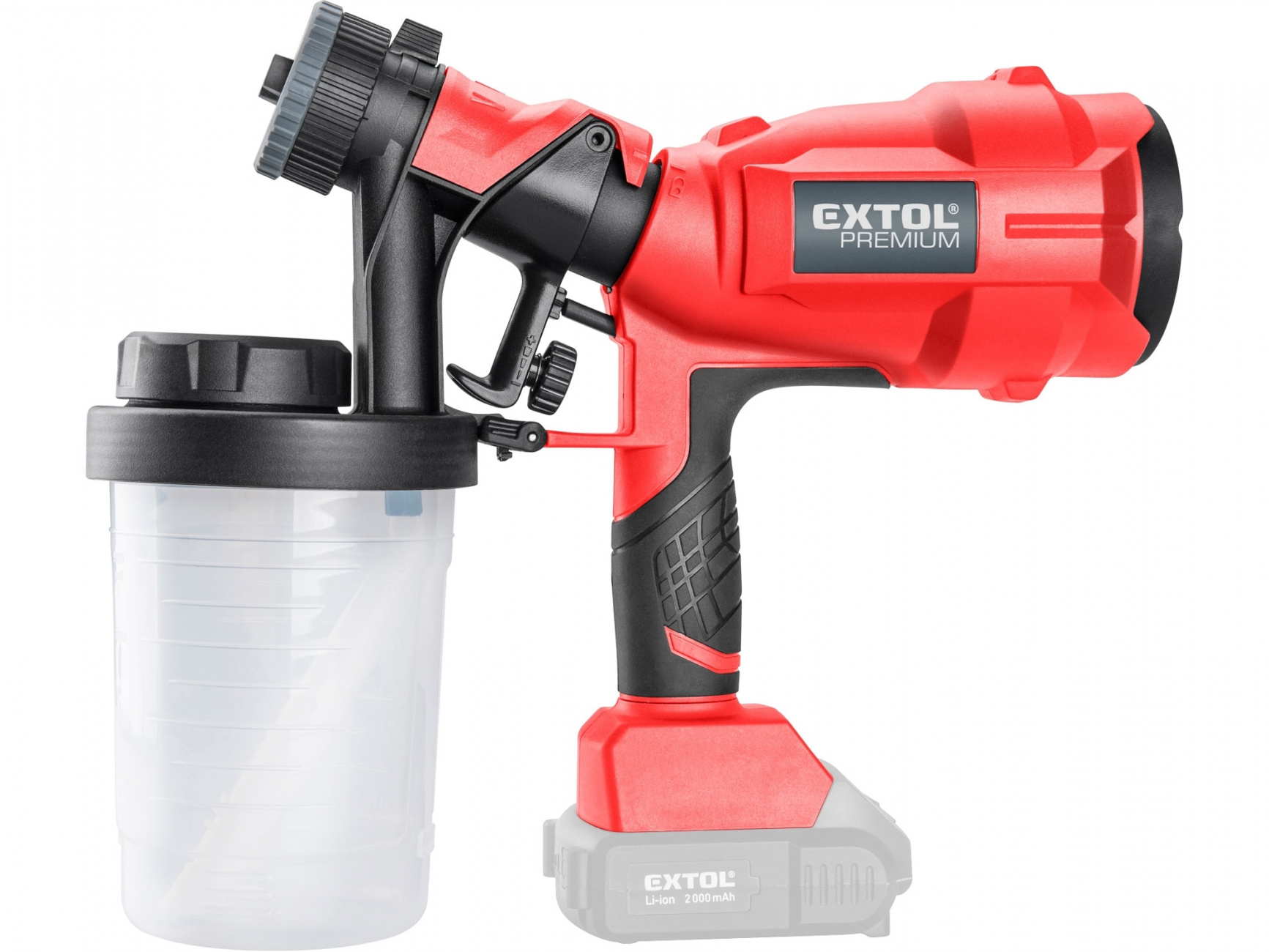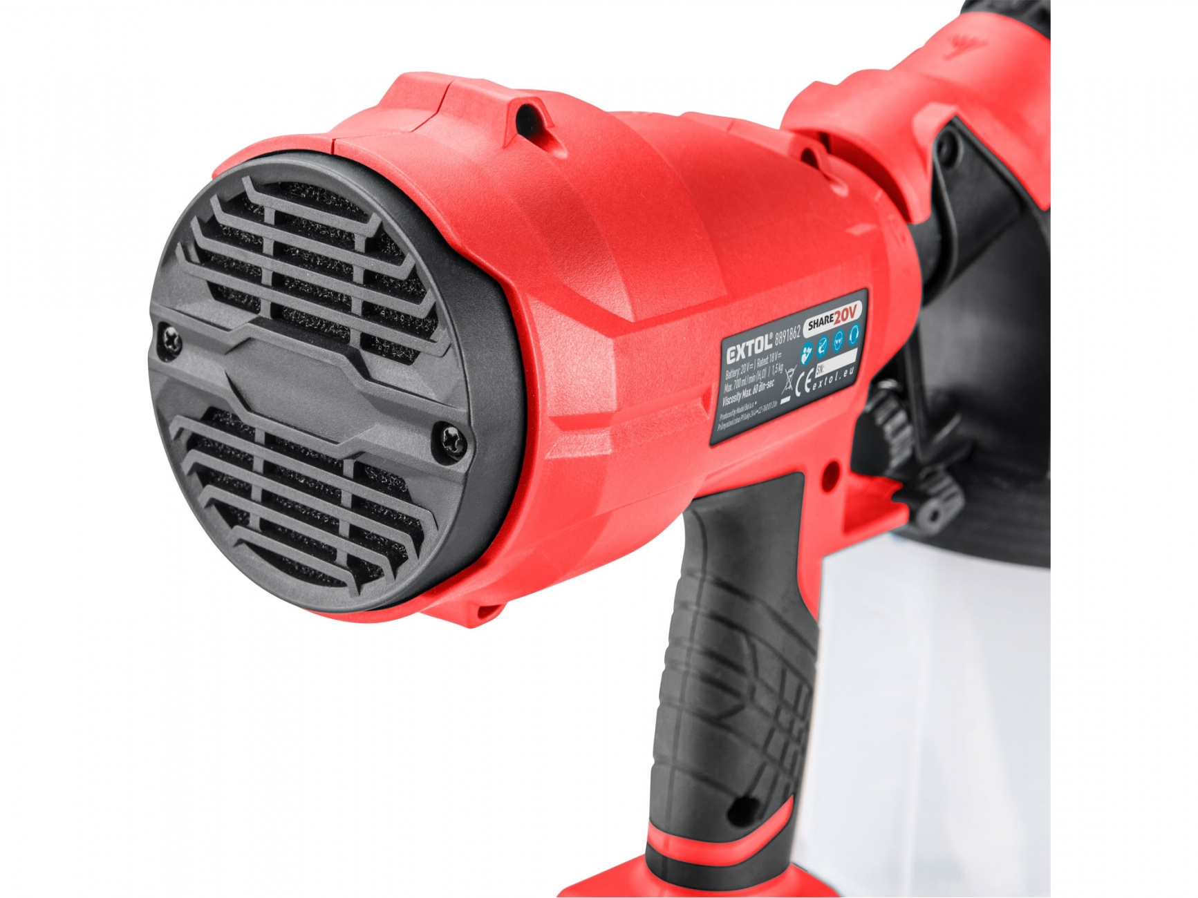 HVLP aku stříkací pistole je ideální pro stříkání barvy doma, na chalupě či v zahradě. Vyšší výkon jí dovoluje používat hustější typy barev nebo méně ředěné barvy, čímž je možno zrychlit práci. Stříkací pistole umožňuje regulovat množství nanášené barvy a má 3 tvary nanášejícího paprsku – horizontální a vertikální paprsek a kruh/bod. Lze použít pro nanášení těchto barev a tekutin: plastických a latexových barev, vodou ředitelných barev, základových a emailových barev, barev na bázi oleje nebo hliníku, krycích laků, uzavíracích nátěrů pro automobily nebo dřevo, mořidel, konzervantů na dřevo, prostředků na ochranu dřeva a rostlin, desinfekčních prostředků. Nádoba na barvu má objem 900ml a díky jejímu designu lze doplňovat barvu bez její demontáže. Pogumovaná rukojeť je příjemnější, lépe se drží a zmenšuje únavu při práci. Pro běžnou práci dostačují jeden nebo dva 2000mAh akumulátory, které můžete rychle nabít v rychlonabíječce, pro náročnější nebo delší práci doporučujeme větší akumulátory s kapacitou 4000–8000mAh. Akumulátor lze použít ve všech typech nářadí řady EXTOL SHARE20V. Díky použité Li-ion technologii je ho možné kdykoliv dobíjet, aniž by se tím snižovala jeho kapacita. Li-ion akumulátor ztrácí energii vlivem samovybíjení velmi pomalu a vydrží dlouho nabitý a připravený k použití.