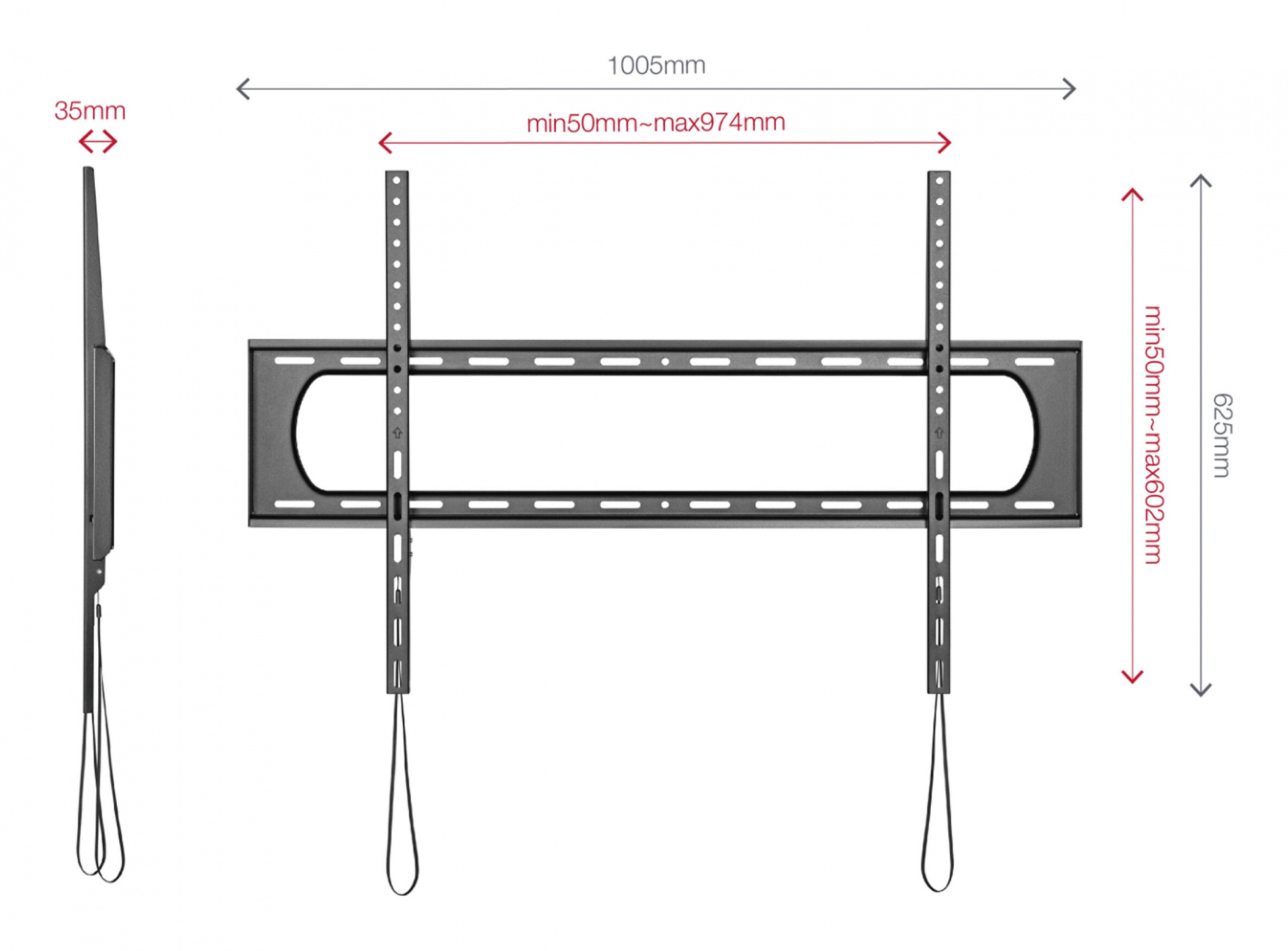 FIX-096PR je extra plochý pevný nástěnný držák určený pro 60'' až 120'' obrazovky, ideální pro ty, kteří hledají bezpečnou a stylovou instalaci pro velké televizory. Jeho robustní konstrukce unese až 120 kg a nabízí velkou všestrannost s několika konfiguracemi VESA od 50x50 do 900x600, které se přizpůsobí široké škále modelů a velikostí obrazovky.
