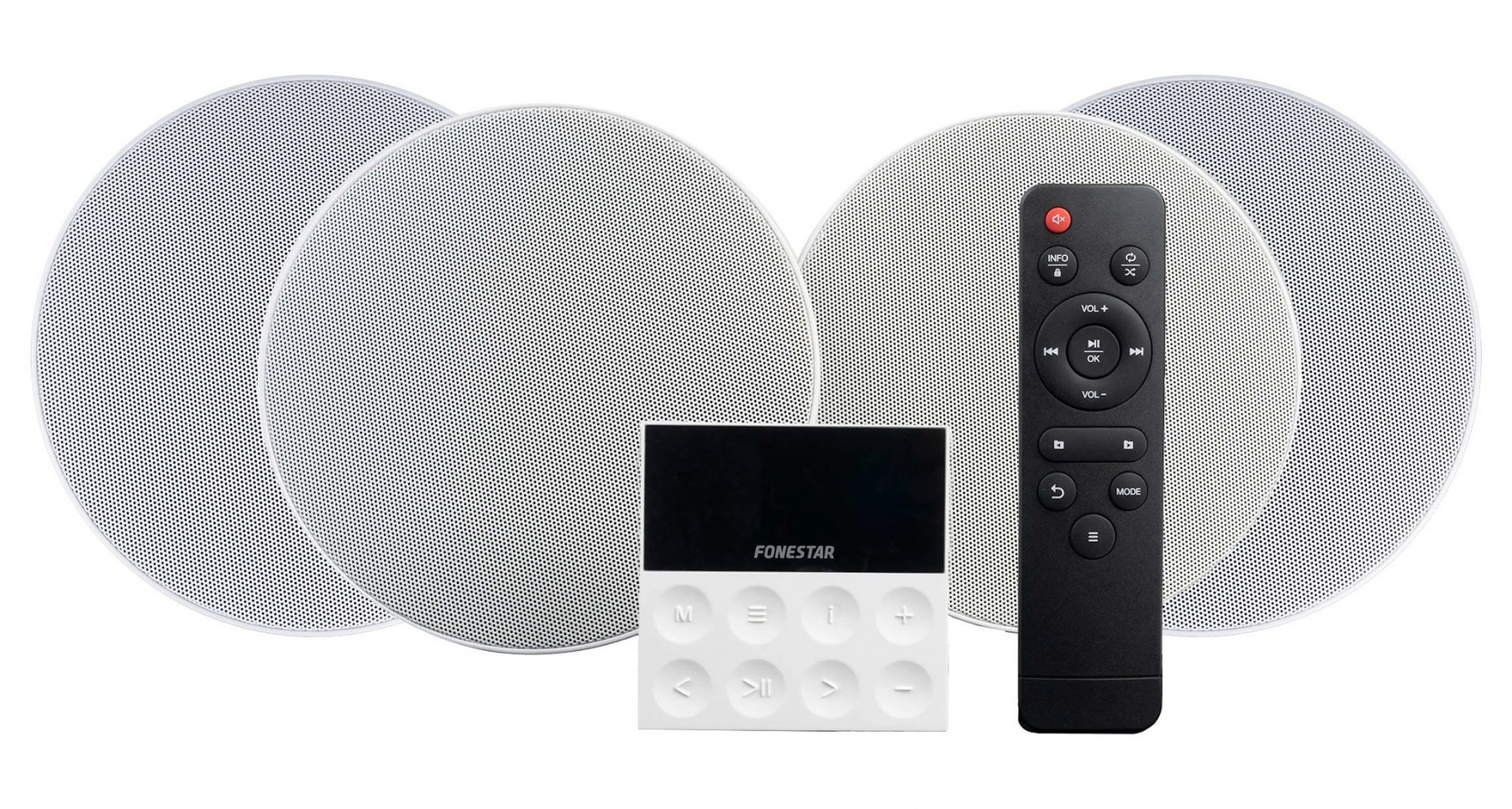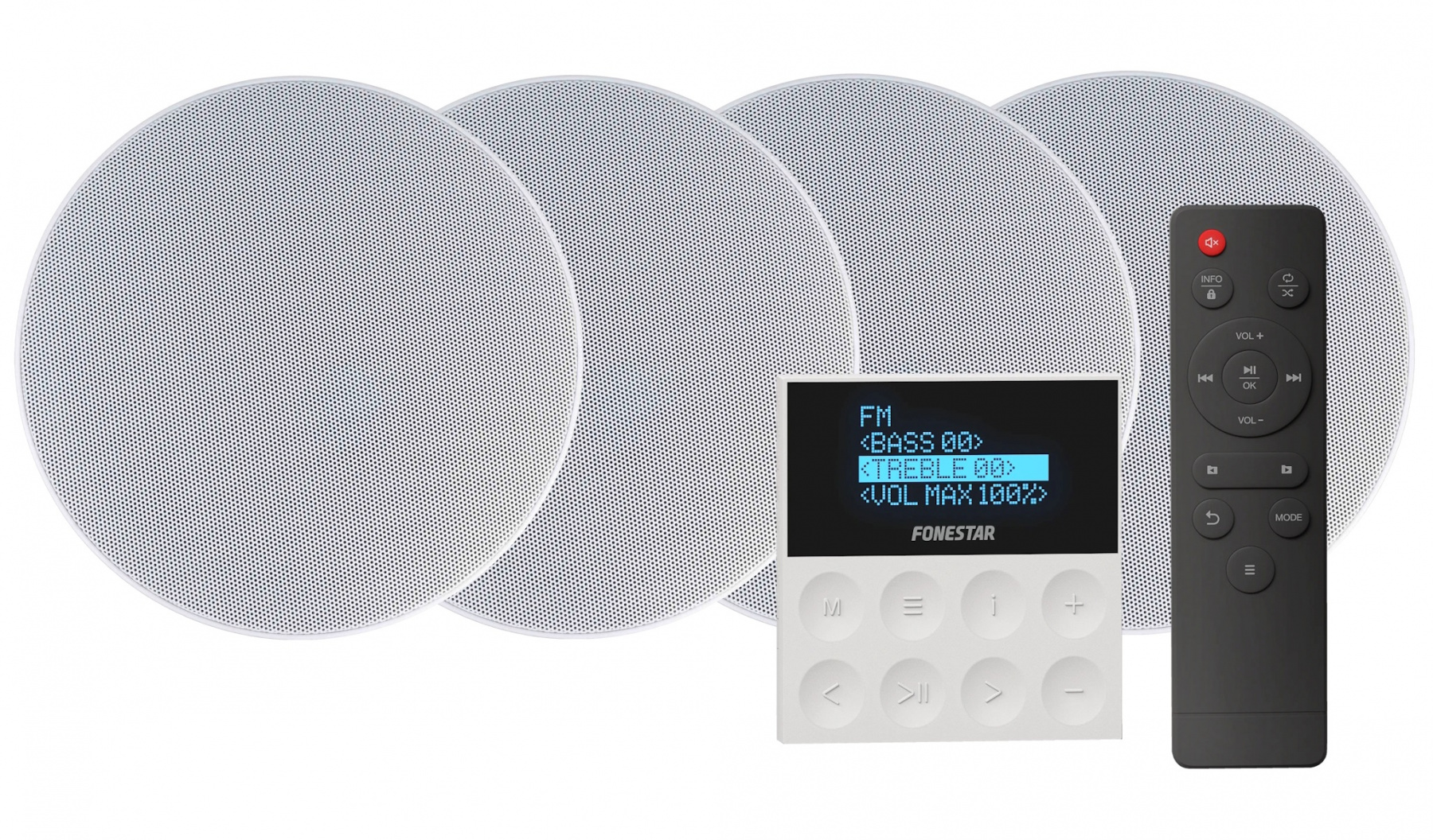 Set 4 stropních reproduktorů a nástěnného stereo zesilovače 2 x 15 W (8 Ω) s Bluetooth, FM rádiem, USB