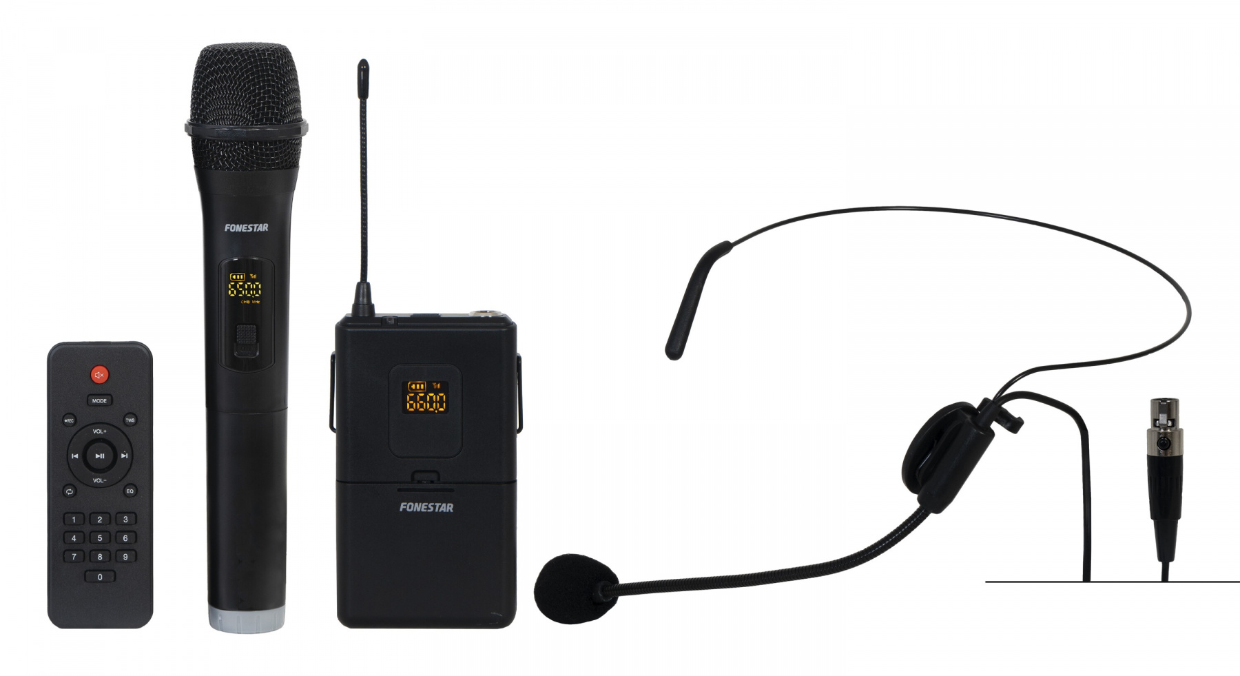 Součástí dodávky jsou dva bezdrátové mikrofony – ruční a náhlavní s bodypack vysílačem – které umožňují maximální volnost pohybu při prezentacích nebo karaoke vystoupeních. Kromě nich můžete připojit i další mikrofony přes dva 6,3mm MIC vstupy s individuálním ovládáním hlasitosti, echo efektem a tónovými korekcemi.