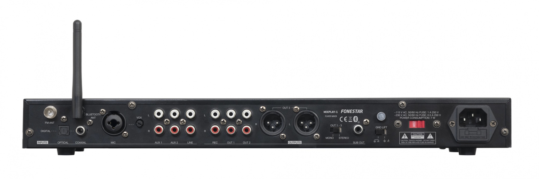 Mikrofonní vstup má prioritní funkcí, která automaticky ztlumí hudbu pro přenos hlasu nebo oznámení, aniž byste se museli starat o nastavení. Smíchá signál mikrofonu s jedním z více vstupů nebo s přehrávačem Bluetooth. MIXPLAY-1 nabízí množství vstupů, které nabízí vynikající konketivitu. Je možné využít digitální vstup (optický nebo koaxiální), 2 pomocné AUX vstupy nebo vstup LINE s linkovou úrovní signálu. Přehrávač nabízí možnosti přehrávání ze zdrojů hudby: Bluetooth, USB nebo FM rádio, což z něj dělá komplexní audio systém. Jeho funkce rekordéru navíc umožňuje nahrávat mix mikrofonu i všechny ostatní vstupy.
