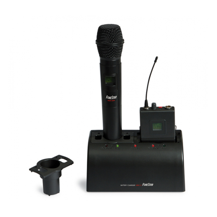 Dobíjecí stanice pro 2 bezdrátové mikrofony řady MSH Bezdrátová dokovací stanice pro nabíjení mikrofonů. Umožňuje dobíjení dobíjecích baterií v modelech mikrofonů: MSHT-40M, MSHT-45P a RI-840. LED indikátor napájení LED indikátor procesu nabíjení LED...