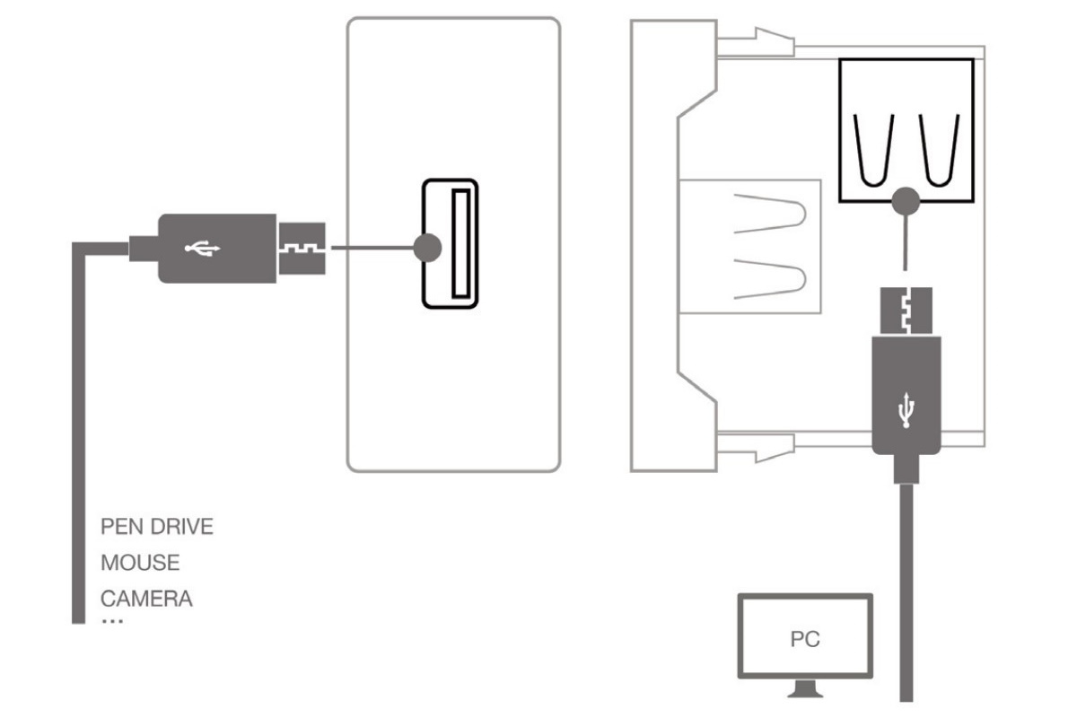 Přípojné místo - zásuvkový model pro připojení USB-A z řady propojovacích panelů pro audiovizuální instalace, učebny, konferenční místnosti atd.