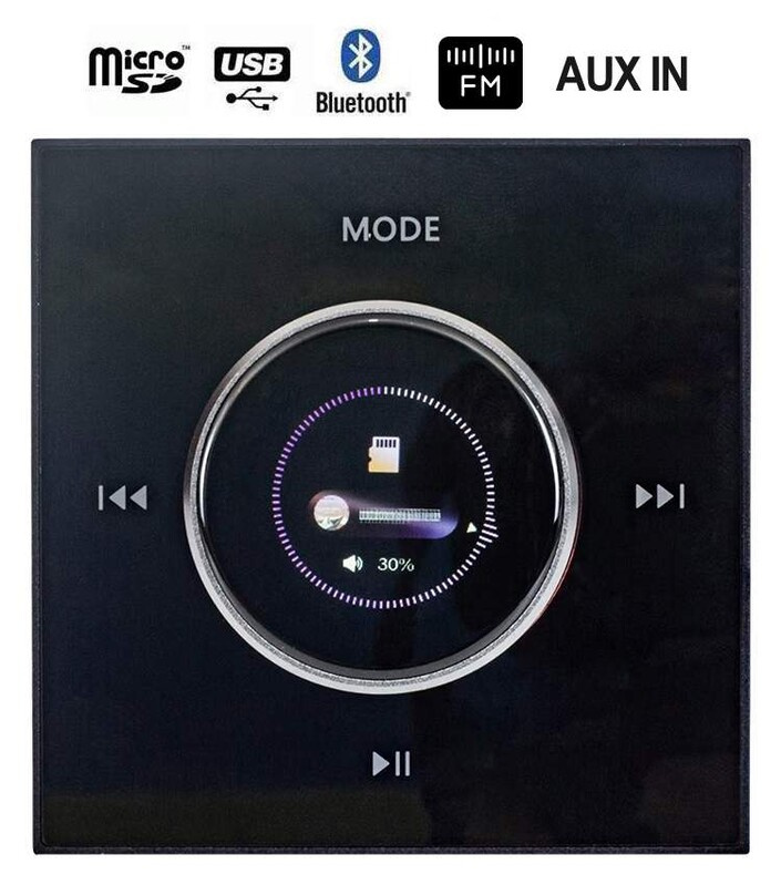 Kvalitní stěnový USB/microSD/MP3 přehrávač s moderním designem a jedinečným intuitivním ovládáním. Kromě MP3 přehrávače obsahuje také FM tuner, Bluetooth přijímač a vestavěný 4-kanálový digitální zesilovač s výkonem 4x 25W do 4ohm. V otočném regulátoru má jemný barevný kulatý grafický LCD displej. Obsahuje také 1x stereo AUX vstup a výstup.K přehrávači je dodáváno IR dálkové ovládání. Montuje se do montážní krabičky (která je součástí balení) do stěny jako vypínač na světlo. Je vhodný pro ozvučení pokoje, kuchyně, koupelny, kanceláře, baru, restaurace nebo tělocvičny. Pomocí přiloženého ovladače lze nastavit také presety ekvalizéru.