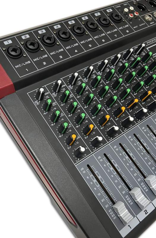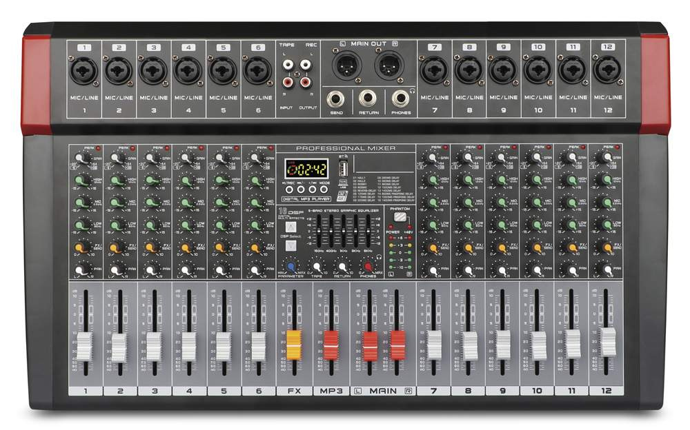 Profesionální mixážní pult, 12 mono vstupů, 1 stereo vstup. Na každém vstupu je 3-pásm. EQ, phantom 48V. Má vestavěný 32bit DSP procesor s 16 volitelnými předvolbami.