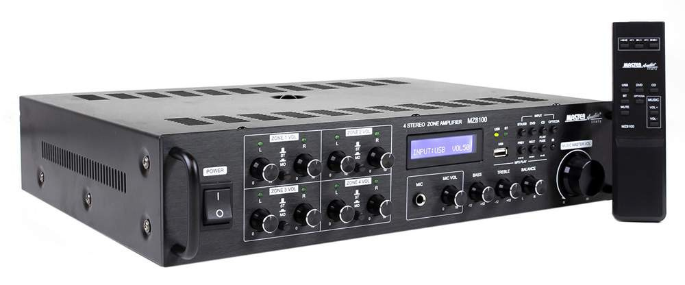 Kvalitní 8kanálový stereo zesilovač. Obsahuje 4 stereo zóny z možností přepnutí kterékoli zóny na mono. Výkon 8x 100W/8ohm nebo 8x 150W/4ohm. Každý kanál má samostatnou regulaci hlasitosti. Zesilovač má vestavěný MP3 přehrávačem s USB vstupem a Bluetooth připojením....