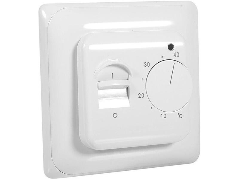 Jednoduchý nástěnný termostat pro topné rohože podlahového topení se sondou o délce 3m. Montáž do hluboké krabice pod omítku.