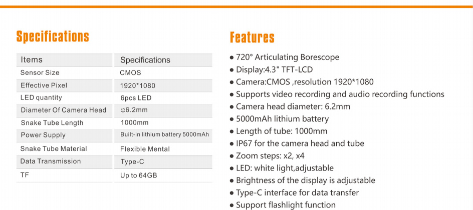Díky pokročilé CMOS kameře, kvalitnímu LED osvětlení, 4.3" LCD displeji a funkci záznamu videa i fotografií přináší OXE ED-801 maximální efektivitu, čistý obraz a pohodlné ovládání. Je ideální pro průmysl, automotive, stavebnictví, revize potrubí, elektroinstalace i domácí údržbu.