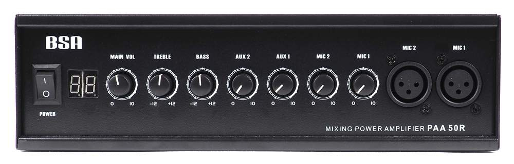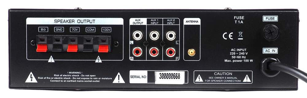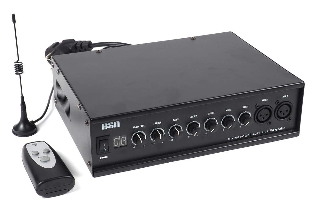 Kompaktní 100V mono směšovací zesilovač s možností nízkoimpedančního zapojení s rádiovým dálkovým ovládáním celkové hlasitosti a MUTE, které umožňuje ovládání i přes překážky do vzdálenosti až 30m. Zesilovač obsahuje 2x mikrofonní vstup (XLR) a 2x stereo AUX vstup...
