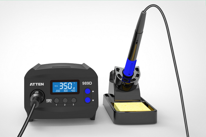 Digitální pájecí stanice ATTEN AT-989D je spolehlivá a přesná digitální pájecí stanice určená pro servisní práce, montáže, drobnou elektroniku i hobby využití. Stanice je vybavena digitálním ovládáním teploty a přehledným displejem, který umožňuje snadné sledování nastavené i aktuální teploty. Topné těleso s rychlým náběhem teploty zajišťuje plynulou práci bez zbytečných prodlev , využívá nízkonapěťové střídavé napájení, což zajišťuje antistatickou ochranu, žádné úniky napětí a žádné rušení.