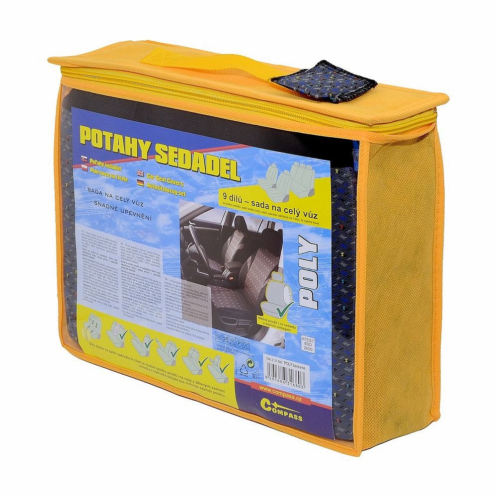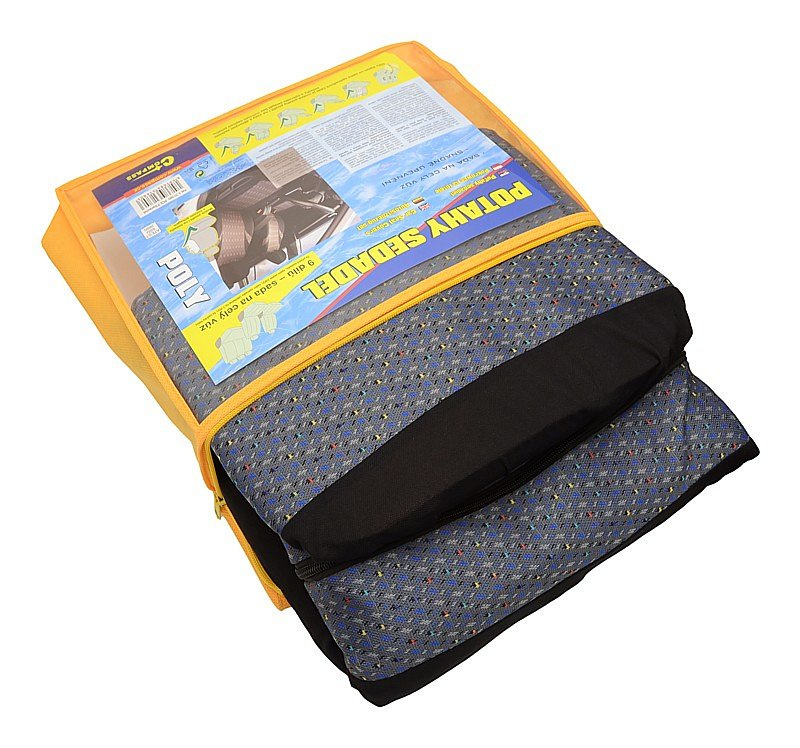 Potahy sedadel "POLY", sada na celý vůz. Lze připevnit na většinu běžně používaných automobilových sedadel. Potah lze použít na sedadlech, která mají zabudovaný boční airbag přímo v opěradle předních sedadel. Balení obsahuje potah na přední sedadlo (2x), zadní sedák (celý), zadní opěradlo (pomocí zipu dělitelné na 3 díly), opěrku hlavy (5x). Díky zipům na zadní opěradlové části je možné potahy použít i na vozy s dělenými zadními sedadly a opěradla sklápět bez nutnosti sejmutí potahu.
