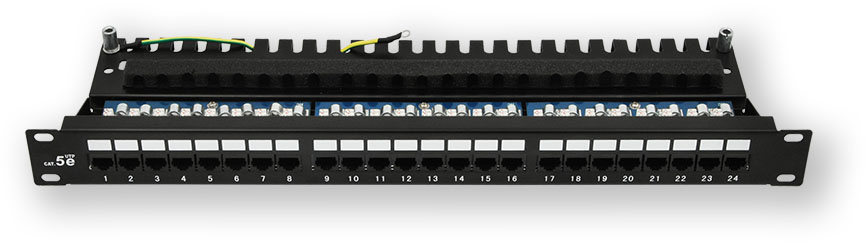 19" patch panel do datového rozvaděče s 24 porty Cat.5e UTP s vyvazovací lištou pro kabeláž. Patch panel je vybaven zářezovými svorkovnicemi typu LSA+ (Krone). K zapojení vodičů je nutné použít nástroje pro tento typ svorkovnice.Typ modulupatch panel datovýPočet portů...