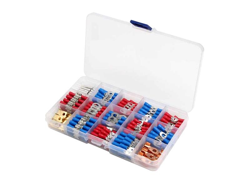 Izolované různé krimpovací konektory dodávané v pevném obalu z pružného plastu