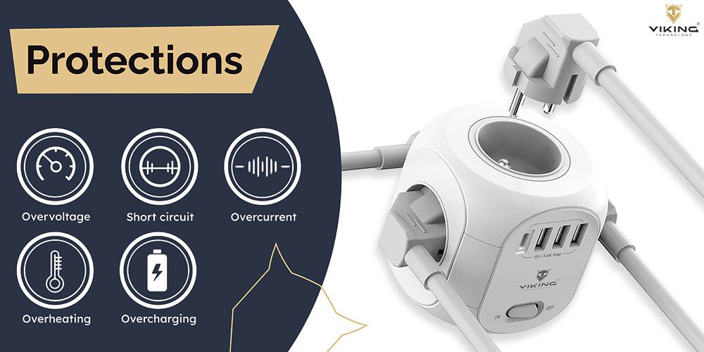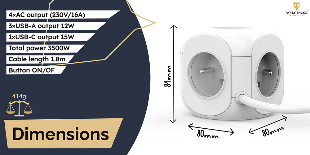 Síťový adaptér Viking AC Cube je praktickou kombinací čtyř zásuvek, čtyř USB portů a 1,8 m prodlužovacího kabelu v jednom, který šetří místo a umožňuje napájení až 8 zařízení současně.