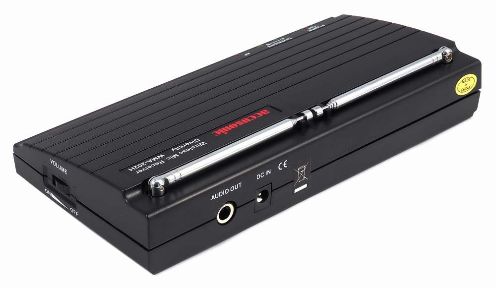 Bezdrátový diverzitní VHF ruční mikrofon. Přijímač obsahuje dvě teleskopické antény a regulaci hlasitosti.