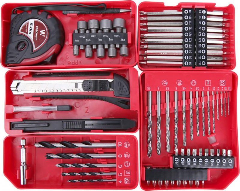 - 14 ks vrtáků HSS do kovu a oceli: 1,5; 1,5; 2; 2; 2,5; 3; 3; 3,5; 4; 4,5; 5,5; 5,5; 6; 6,5 mm.