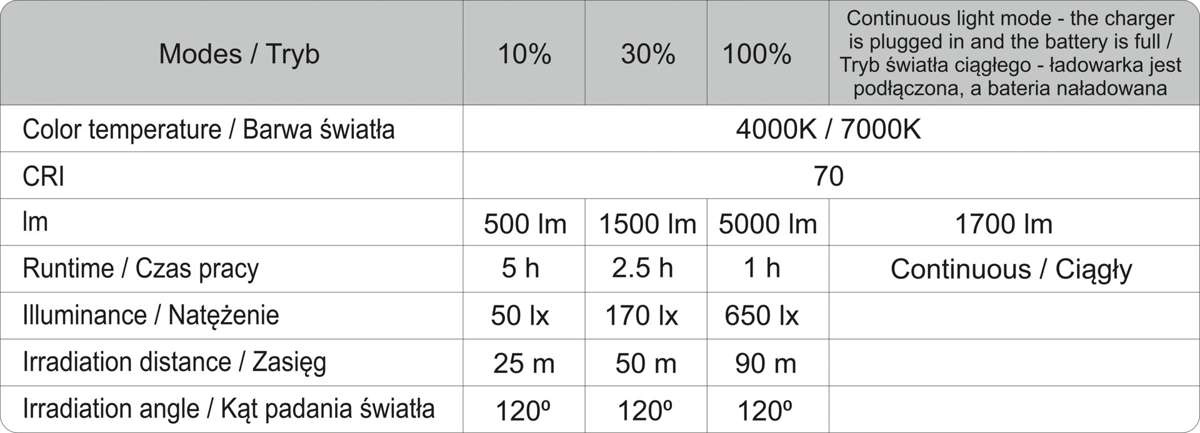 3 režimy provozu na baterie: 5000lm (100%) / 1500lm (30%) / 500lm (10%)