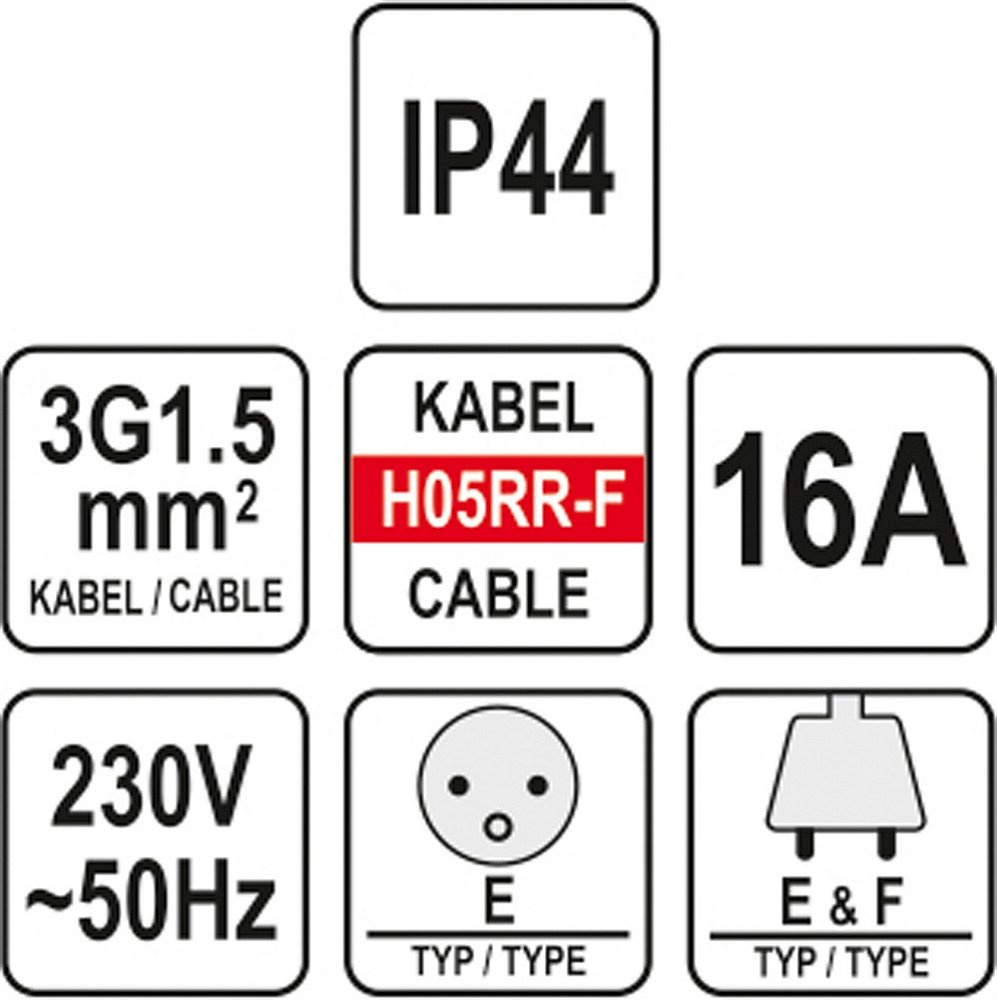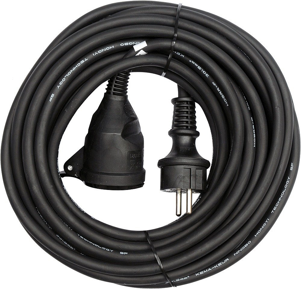Vysoce kvalitní 40m izolovaný prodlužovací kabel. Kabel je vyroben ze 3 měděných vodičů o průřezu 1,5 mm2 každý. Takový průřez kabelu umožňuje připojení zařízení často používaných na stavbě, v dílně nebo ve výrobním závodě na tyto prodlužovací šňůry. Kabely jsou pokryty izolací z přírodního kaučuku H05RR-F, která je vysoce odolná proti mechanickému poškození, povětrnostním vlivům a chemickým látkám (chladicí a mazací oleje, benzín nebo etyl a metylalkoholy). Tato izolace poskytuje jmenovité napětí 300V / 500V. Prodlužovačka je navíc vyrobena v souladu s normou IP 44. Díky použití špuntů odolných proti prachu a stříkající vodě umožňuje použití těchto prodlužovaček v interiéru i exteriéru, např. na stavbě, na zahradě , na náměstích před výrobními závody. Díky odolnosti proti stříkající vodě a prachu poskytuje vynikající ochranu proti vlhkosti, prachu a písku Maximální výkon připojeného zařízení: 3680 W